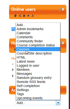 I want to display course categories at there, you can select the value 'list of categories' in 'front page' and 'front page items when logged.